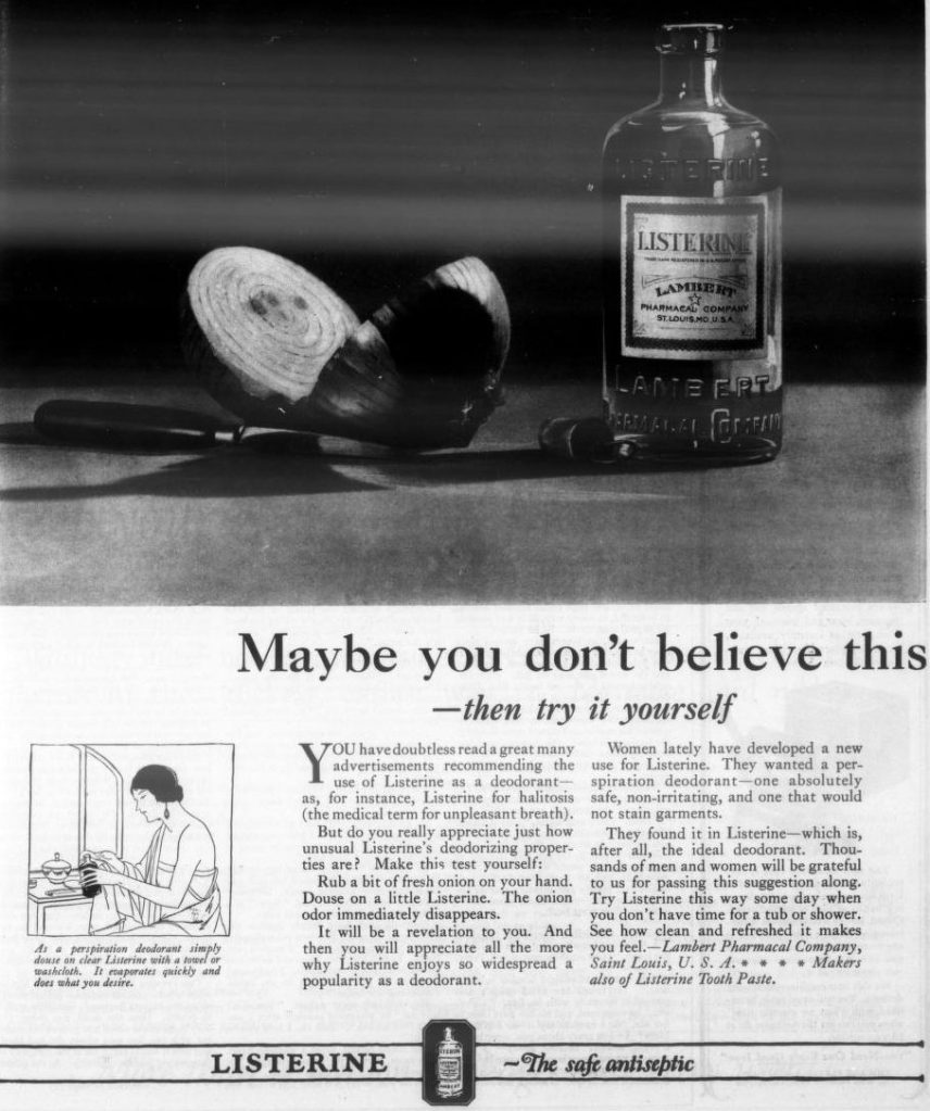 Today, it has not been thought of as a deodorant for any other part of the body except the mouth. However, it is said that since Listerine is an antiseptic, it can be used to treat minor skin conditions. Although the use is different, it is the idea of using an already existing product for other uses is similar today. This idea is categorized as “hacks.” There are so many different hacks that we come across on all social media platforms informing people of the various uses other than what’s advertised of a product. People are always looking for solutions to save time and effort, so that is a commonality between both time periods.