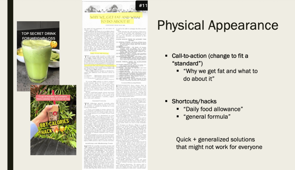 In conclusion, examining the 1920 volume of Ladies’ Home Journal alongside today’s wellness trends reveals both the evolution and persistence of certain cultural patterns in how health, wellness, and beauty are marketed, especially to women. While the mediums have changed, the core messages remain the same: health is a personal responsibility often tied to physical appearance, moral standards, and the consumption of health products. Whether through informative articles or modern influencer-sponsored posts, the theme remains relatively consistent. Despite the century between them, the tension between medical authority and profit-driven health messaging, as well as the gendered nature of wellness advice, continues to shape how society perceives health. By reflecting on these historical and contemporary trends, we gain insight into the influence of media on our collective understanding of health and wellness.