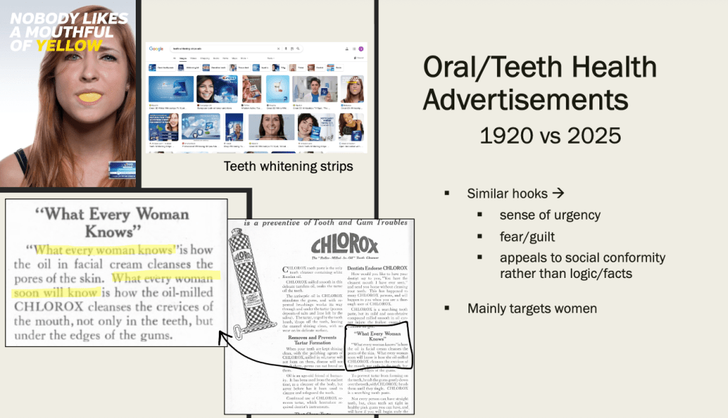 One ad promoted a laxative that promised to “brighten your mood” and restore energy. Such ads often blurred the line between physical and emotional well-being, suggesting that a single product could restore one’s overall quality of life. These examples illustrate the tension between trusted medical authorities and profit-driven health messaging, a tension that remains highly relevant in our current media landscape. One strong similarity is the continued gendering of wellness messaging. Just as women in 1920 were targeted with products to manage stress, regulate their periods, or slim their figures, today’s women are often the primary audience for wellness content, though the tone has shifted to emphasize empowerment and “self-care.” Both eras, however, place the burden of wellness squarely on the individual, particularly women.