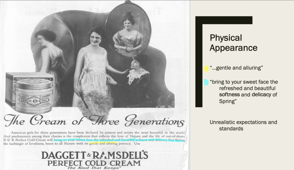 This is very similar to current wellness trends seen on social media platforms like Instagram and TikTok, where influencers often promote beauty products, skincare routines, and self-care rituals as essential to both physical health and emotional well-being. Much like the Ladies’ Home Journal advertisements, today’s social media influencers emphasize the idea that looking good equates to feeling good, and that self-care is a necessary part of living a healthy life. These influencers, often with no medical qualifications/backgrounds, market products that promise emotional and physical benefits, blending beauty and health in ways that mirror the promises made in 1920s advertisements.