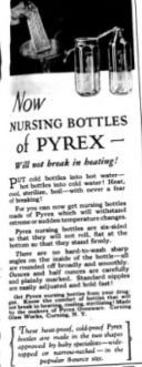 An example of this is a “futuristic” baby’s bottle called PYREX. It had a unique geometric shape and was designed to hold liquids that had extreme temperatures, like hot soup or cold water. Its pointy sides and square base were also included to ensure that there were no sharp, hard-to-wash angles inside the bottle that allowed for bacteria accumulation. The advertisement also included a note at the bottom that the bottle’s design was approved by “baby specialists,” likely as a way to give its unique shape a form of legitimacy compared to its other competitors.