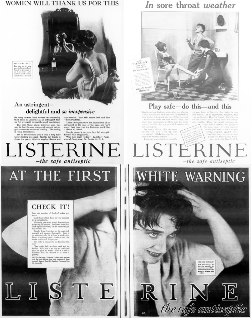 This research provides a good understanding on how differently we advertised health related products back then as opposed to now. This can be seen not only through the products but the target audience which tended to be women. Not only are the methods different, but the way in which some products were used. Listerine especially surprised me with the different ways it was used. It really was interesting to see how it was considered to be a multipurpose product especially with the knowledge I have about the product now. Overall, there is so much one can learn about health over time!