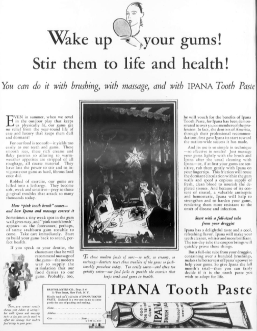 One of the most commonly advertised products within the whole volume would have to be Ipana toothpaste. It was not too surprising that a dental product would be one of the most advertised but it was interesting to see the placement of these advertisements. Ipana toothpaste advertisements were usually placed at the last page of most issues in Volume 44. They typically advertised the gums as not being properly stimulated and Ipana being the solution for healthy gums and teeth. When looking for a comparison on what Ipana is advertised like today, I found out that Ipana toothpaste was discontinued in the 1970s as the company was choosing to rebrand. Their company had decided to focus on pharmaceuticals instead. Therefore, Ipana is no longer sold in stores today.